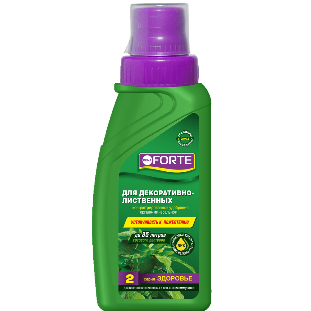 Серия ЗДОРОВЬЕ создана лабораториями Bona Forte для восстановления истощенной почвы и повышения иммунитета растений. Подходит для алоказии, аспарагуса, антуриума, диффенбахии, драцены, калатеи, кротона, колеуса, маранты, монстеры, плюща, сансевиерии, фатсии, фикусов, финика, филодендрона, ховеи, юкки и многих других. Здоровье – первый и основной шаг к красоте декоративных растений. Удобрение содержит полный комплекс веществ, необходимых для полноценного и сбалансированного питания растений: