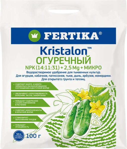 Комплексное удобрение Kristalon Огуречный, 100 г. Срок хранения минеральных удобрений 5 лет. Хранить в полиэтиленовом пакете или пластиковой закрытой таре, чтобы не попадала влага, на полках. На полу (в гаражах и подвалах) лучше не хранить, т.к. возможно скопление конденсата и затвердевание удобрения. Замораживание, отрицательные температуры не влияют на полезность удобрения. Водорастворимое Фертика Kristalon Огуречный 100 гр комплексное азотно-фосфорно-калийное удобрение, содержащее микроэлементы. Используется при выращивании всех культур семейства тыквенных, в том числе огурца в открытом грунте и теплицах. Повышает урожайность, а также качество плодов. Применяется в виде водного раствора, как под корень, так и в качестве листовой подкормки в течение периода вегетации растений. При выращивании рассады 10 г продукта растворяют в 10 литрах воды и поливают рассаду один раз в неделю. При выращивании овощных культур. Для культур защищенного грунта при каждом поливе использовать 0,1-0,2%-ный раствор (10-20 г/10 л. воды). Для открытого грунта также применяют 0,1-0,2%-ный раствор 1 раз в 2 недели. Листовая подкормка. Обработку проводят 1%-ным раствором (10 г в 1 л. воды, при использовании опрыскивателя). Fertika Кристалон комплексное удобрение для огурцов. Водорастворимая универсальная подкормка для огурцов, кабачков, патиссон.