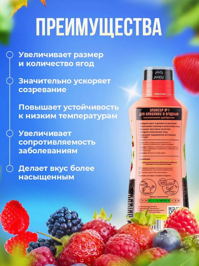 Жидкое удобрение для ягод, клубники, малины, смородины, крыжовника. Эликсир №1 Органик Микс для ягод увеличивает урожай размер и количество ягод, количество завязей. Делает вкус более насыщенным. Удобрения для рассады - это антистресс для растений. Натуральные концентрированные растительные экстракты глубокой ферментации. Удобрение для грунта можно применять при посадки рассады и саженцев клубники, земляники, смородины. Комплексная подкормка-дозреватель, применяемая на стадии цветения, завязывания плодов и плодоношения.