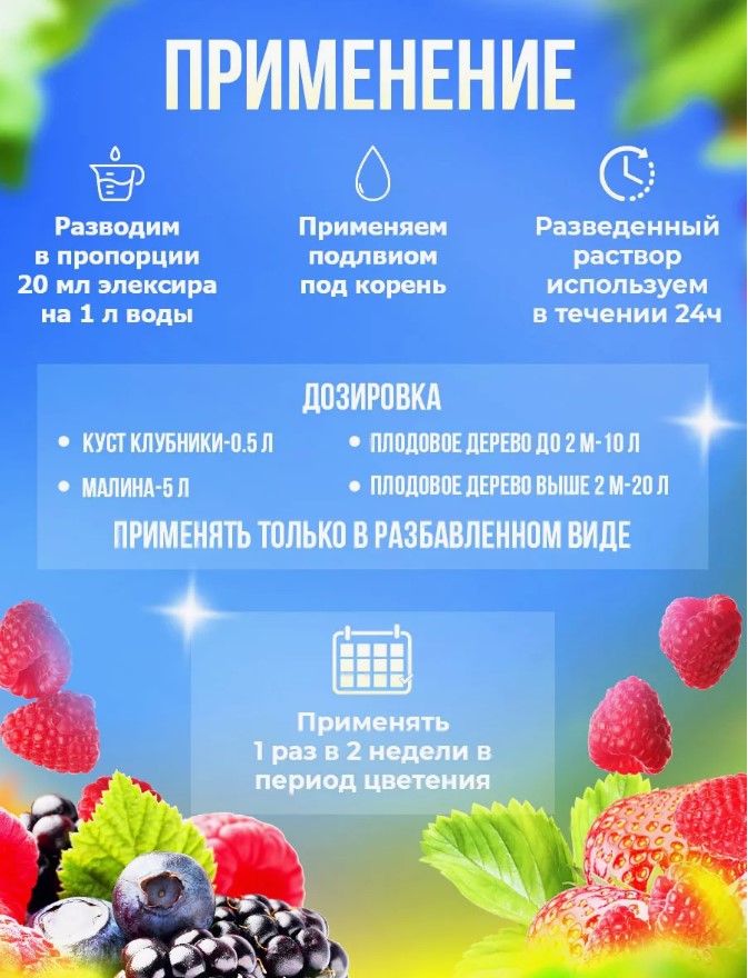 Дозировка: 20 мл разбавить в 1 л воды. Куст клубники- 0,5 л. Малина- 5 л. Плодовое дерево до 2 метров- 10 л. Плодовое дерево выше 2 метров- 20 л. Для взрывного эффекта совмещать с применением гранулированного удобрения Органик Микс для клубники и ягодных.