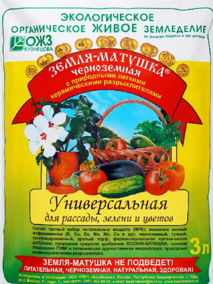 Черноземные почвогрунты Земля-Матушка оздоровлены природными биопрепаратами Фитоспорин и Гуми, полезной почвенной микрофлорой; сбалансированы по элементам питания и микроэлементам; обогащены природным гумусным удобрением Хозяин-Батюшка и природными легкими керамическими разрыхлителями, которые делают почву структурной, высокоплодородной и воздушной.