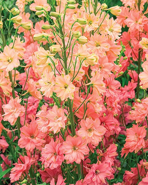 Уникальный окрас: Роскошный лососево-розовый цвет — большая редкость среди дельфиниумов.