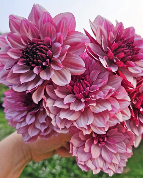 Утонченный сорт георгина с роскошными соцветиями сложной окраски. Густомахровые цветки сочетают сливочно-кремовую основу с насыщенными сиренево-пурпурными краями лепестков. Градиентный переход от светлого центра к темному краю создает эффект ручной росписи. Форма цветка — декоративная, с широкими волнистыми лепестками, собранными в плотную розетку.
