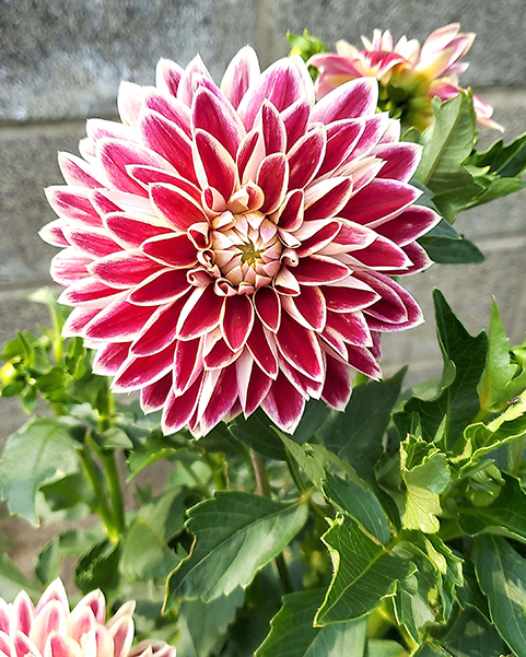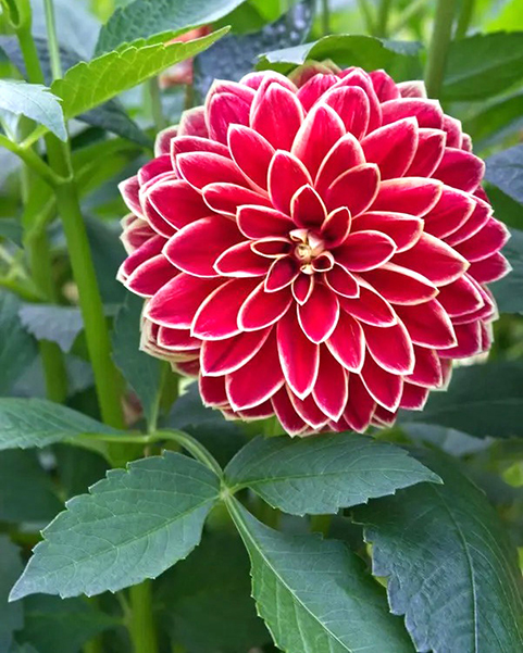 Декоративный сорт георгина с яркими алыми соцветиями насыщенного оттенка с белой окантовкой. Крупные махровые цветки состоят из широких, плотно расположенных лепестков, формирующих пышную симметричную розетку. Интенсивный красный цвет сохраняется в течение всего периода цветения, не выгорая на солнце. Куст мощный, с прочными стеблями и густой зелёной листвой, подчеркивающей яркость соцветий.