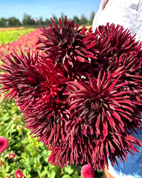 Полукактусовый сорт георгина с благородной тёмно-бордовой окраской, приближающейся к чёрному оттенку. Узкие, слегка скрученные лепестки с заострёнными кончиками образуют изящную игольчатую структуру с лёгким изгибом. Глубокий бархатистый тон эффектно контрастирует с золотистой серединкой цветка. Куст стройный, с прочными стеблями и тёмно-зелёной листвой с лёгким бордовым отливом.