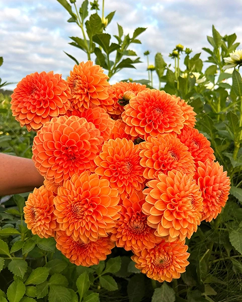 Шаровидный сорт георгина с яркими оранжево-тыквенными соцветиями насыщенного теплого оттенка. Идеально округлые махровые цветки состоят из плотно уложенных лепестков, формирующих гладкую сферу. Насыщенный оранжевый цвет с легким медным отливом создает эффект солнечного сияния в саду. Куст мощный, с прочными цветоносами и густой зеленой листвой.