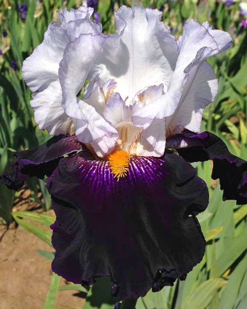 Изысканный сорт бородатого ириса с глубокой и драматичной окраской. Цветок сочетает насыщенный тёмно-пурпурный, почти чёрный оттенок фолов (нижних лепестков) и более светлые, дымчато-сиреневые стандарты (верхние лепестки). Эффектная бородка яркого золотисто-жёлтого цвета создаёт контрастный акцент, подчеркивая глубину основного тона.