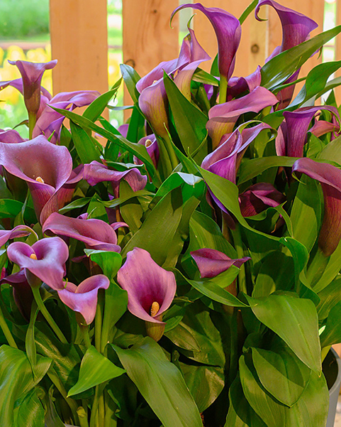 Компактный сорт каллы с изящными соцветиями и яркой листвой. Покрывало насыщенного розово-сиреневого оттенка с тонким зеленоватым краем, элегантно обрамляет солнечно-жёлтый початок. Тёмно-зелёные листья с контрастными серебристыми крапинами сохраняют декоративность до осени.