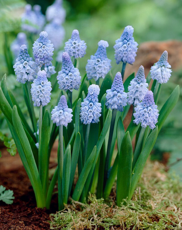 Маленькие трогательные цветы мускари напоминают грозди крошечных колокольчиков, плотно собранных на тонкой зелёной ножке. Большую часть года Вы даже не будете подозревать об их присутствии и только весной, в апреле или мае, вдруг, как будто по волшебству, появятся из-под земли яркие фиолетовые, синие, голубые, белые или розовые соцветия с сильным приятным запахом, отдалённо напоминающим мускус, за что растение и получило своё название. Впрочем, мускари также частенько называют мышиным гиацинтом из-за его маленьких размеров (10-30 см) и сходства с обычным гиацинтом.