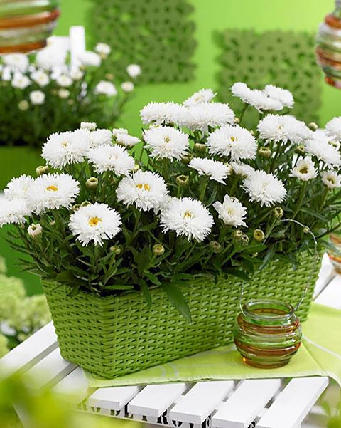 Напоминает хризантему – такой же пышный, махровый и жизнерадостный. Крупные белоснежные цветки достигают 12 см в диаметре, а их изящные, сильнорассечённые лепестки придают им особое очарование. Радует продолжительным и обильным цветением. Компактный куст разрастается до 40 см в ширину. Это изящное растение с ажурной листвой и мощными прямыми стеблями, увенчанными огромными соцветиями-корзинками (10–12 см). Отлично стоит в букетах – до 10 дней. В цветниках эффектно смотрится в сочетании с маками, колокольчиками и дельфиниумами. Требует регулярного полива, а на питательных, богатых органикой почвах цветки становятся ещё крупнее и выразительнее. На зиму желательно утеплить слоем сухой листвы (10–15 см), а с приходом весны укрытие следует снять, чтобы предотвратить выпревание.