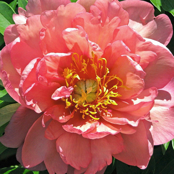 Элитный ИТО-гибрид с крупными махровыми цветками в потрясающей сливочно-желтой гамме. По волнистым лепесткам расходятся розовые, персиковые и насыщенно-вишневые пятна. По мере распускания цветок меняется, становится еще интереснее по тону и привлекает внимание сложной, живой окраской. На одном взрослом кусте за лето появляется от 50 до 80 бутонов! Цветение продолжается около трех недель. Куст плотный, округлый, с прочными стеблями и густой темно-зеленой листвой. Сорт устойчив к заболеваниям. Зимостойкость до −37 °C.