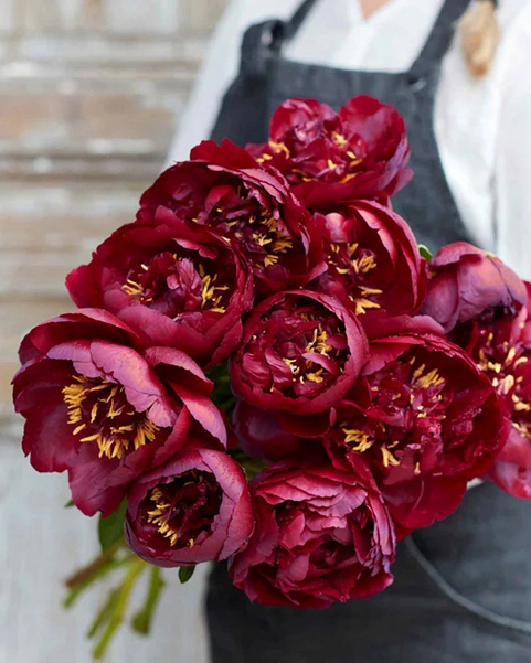 Травянистый пион с эффектными махровыми цветами насыщенного темно-красного оттенка. Крупные желтые тычинки, контрастирующие с бархатистыми лепестками, придают сорту особую выразительность. Форма цветка розовидная, с плотно расположенными лепестками.