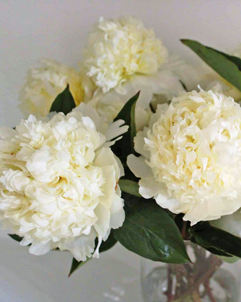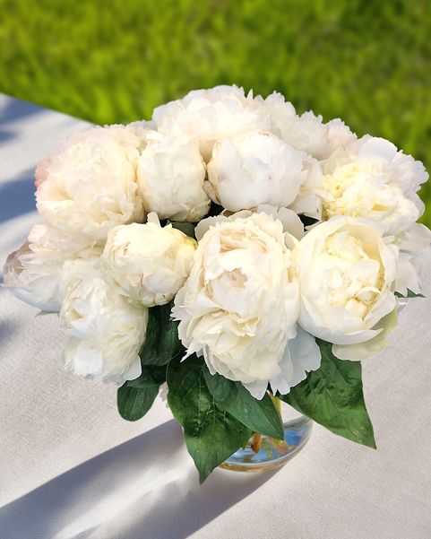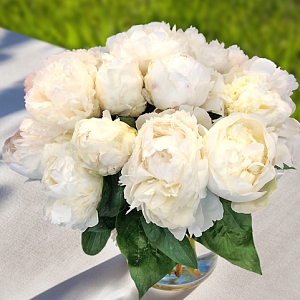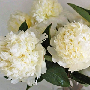 Травянистый пион с пышными махровыми цветами бомбовидной формы. Нежные лепестки плавно переходят от нежно-розовых и сливочных оттенков в центре к чисто белым по краям, создавая эффект нежного градиента. Плотные бутоны гармонично сочетаются с ажурной зеленой листвой.