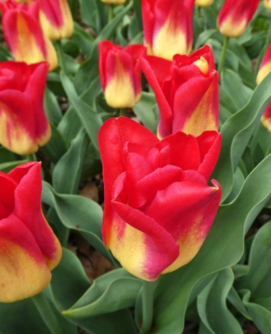Контраст алого и желтого создает впечатление живого огня – лепестки словно сплетаются в языки пламени. Бокаловидный бутон высотой около 8 см выглядит особенно элегантно. Цветок долго сохраняет свежесть в срезке, оставаясь выразительным и нарядным.