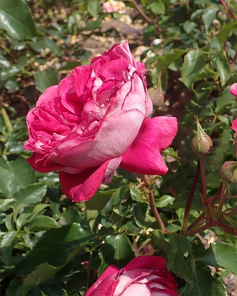 Махровые цветки диаметром 8–-10 см наполнят ваш сад волшебным благоуханием. . С внутренней стороны лепестки ярко-розовые, с внешней – серебристо-белые. Аромат интенсивный, умеренно-сладкий. . Цветение обильное дважды за сезон. Глянцевая листва устойчива к мучнистой росе и черной пятнистости. Зимостойкость до −–25 °С.