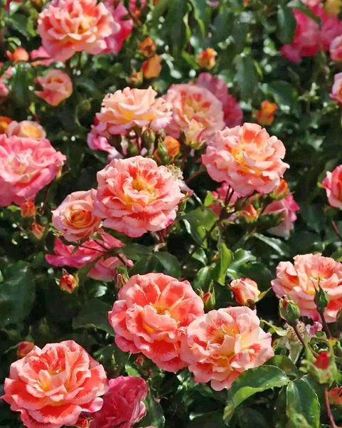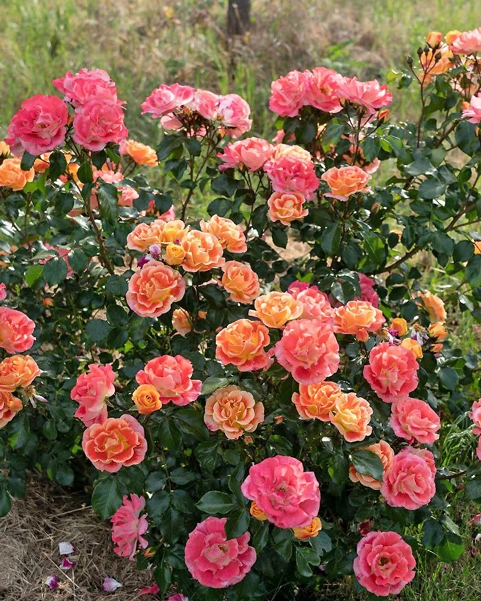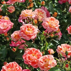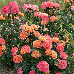 Полумахровые чаши-цветки, диаметром 7–-8 см, окрашены в красные, оранжевые, желтые и кремовые тона. На лепестках отчетливо виден оранжево-красный крап. При раскрытии обнажают пучок золотистых тычинок. Цветет повторно в течение сезона. Аромат отсутствует. Сорт энергичный с многочисленными прямостоячими ветвями. Куст компактный, шаровидный. Листва высокоустойчивая к чёрной черной пятнистости и мучнистой росе. . Зимостойкость до −–25 °С.