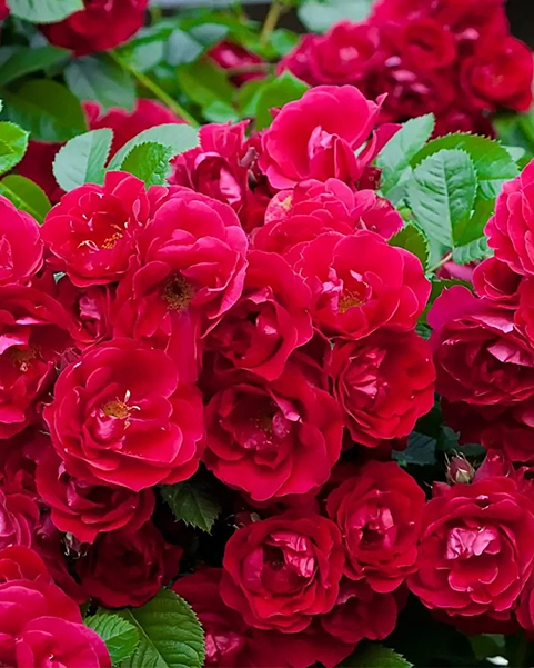 Полумахровые цветки 5–-7 см в диаметре за лето изменяет изменяют форму от конического бутона до плоскочашевидной. Собраны в большие соцветия по 15–-25 штук в каждом. Окрас темно-малиновый и бордовый. Цветение роскошное и длительное с небольшими перерывами. Аромат слабый. Неприхотлива, имеет хороший иммунитет к болезням и вредителям. Зимостойкость до −–35 °С.