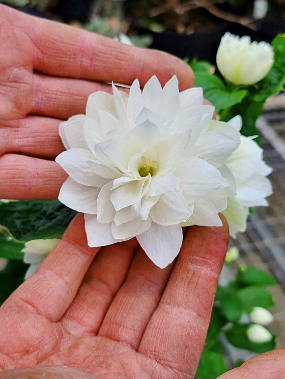 Приобретение этого сорта жасмина станет одним из лучших декоративных решений для вашего сада! Поверьте! Аккуратный невысокий кустарник с изящно изогнутыми побегами и листвой насыщенного зеленого цвета. В середине июня куст покроется крупными махровыми цветками, до 8 см в диаметре, белоснежными с перламутровым блеском и необыкновенно приятным ванильным ароматом. Растение очень неприхотливое, зимостойкое. Одним словом, драгоценность!