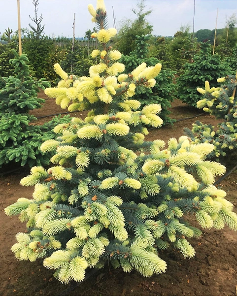 Уникальный сорт голубой ели, отличающийся непревзойденными декоративными качествами. Особенно эффектна весной, когда молодые приросты окрашиваются в кремово-белые тона, создавая выразительный контраст с сизо-голубой зрелой хвоей. Компактная медленнорастущая форма с правильной симметричной кроной.