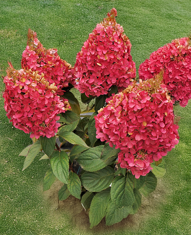 Особенность сорта – контрастная вершина соцветия. На протяжении всего цветения она остается белой, выделяясь на фоне нижних цветков и темно-бордовых побегов с фиолетовым оттенком. Конусообразные метелки до 30 см, с широким основанием и очень пышные, почти целиком состоят из стерильных цветков, тогда как фертильные сосредоточены в верхней части конуса. Куст вырастает до 1,5 м, иногда достигает 2,5 м, подвязки не требует. Не теряет декоративности осенью, так как сбрасывает листья очень поздно. Эта гортензия неприхотлива, прекрасно приспосабливается к полутени и способна зимовать даже под легким слоем снега.