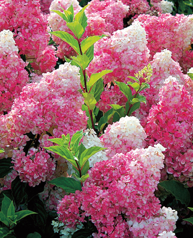 Особой любовью из года в год пользуется этот поразительно красивый сорт гортензии метельчатой. Роскошный облик сочетается с неприхотливостью содержания и хорошей зимостойкостью. Шапки соцветий меняют окраску со сливочно-белой на ванильно-клубничную, а к моменту окончания цветения они темнеют и становятся практически малиновыми, при этом верхушки остаются белоснежными. Распускаются бутоны в разное время, и куст поражает разнообразием оттенков. Кусты раскидистые, адаптируются к различным почвам и условиям. Цветение пышное и продолжительное. Зимостойкость до −35 °С.