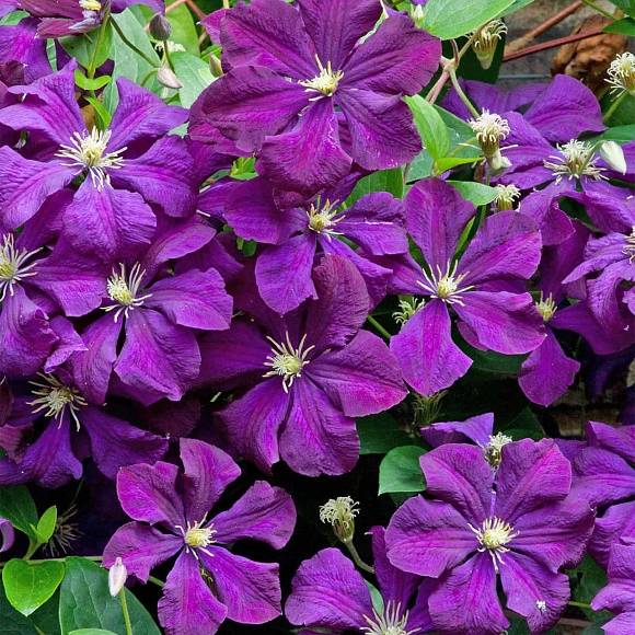 Необычайно выразительный обильноцветущий ампельный сорт с темно-фиолетовыми бархатистыми цветками. Цветки крупные, до 15 см в диаметре, звездчатой формы, по 4–6 лепестков в бутоне. Сливочного цвета тычинки с золотистой пыльцой нежно контрастируют с яркими насыщенными лепестками. Этот клематис обильно и долго цветет на побегах текущего года, густо оплетая любую опору. Подходит для заборов, арок и пергол, особенно хорош рядом со светлыми кустарниками и розами. Зимостойкость до –34 °C.