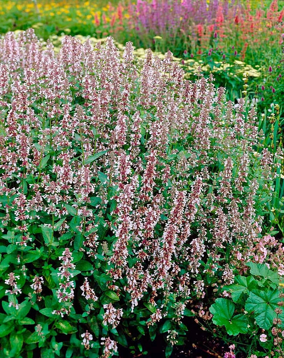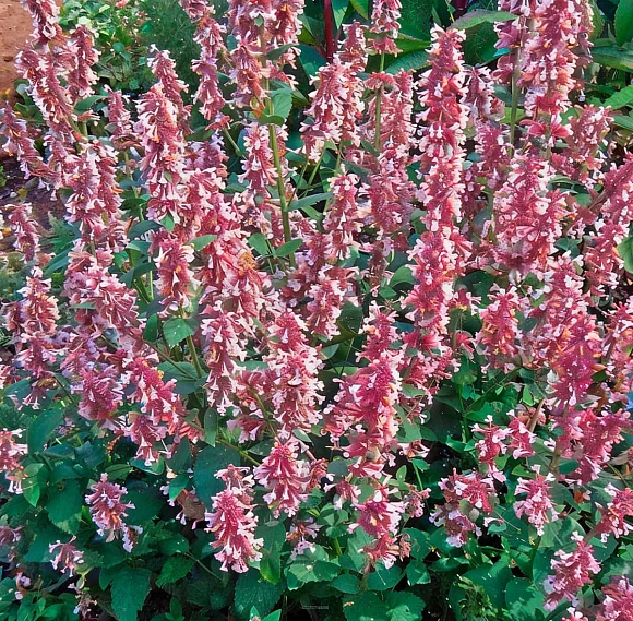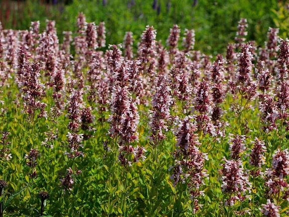 Пушистый куст с розово-сиреневыми соцветиями-колосками и сизо зеленой листвой радует цветением все лето. Формирует плотные куртины, неприхотлив и быстро разрастается, красиво обрамляя дорожки. Является медоносом, источает мятный аромат, привлекая пчел и бабочек.