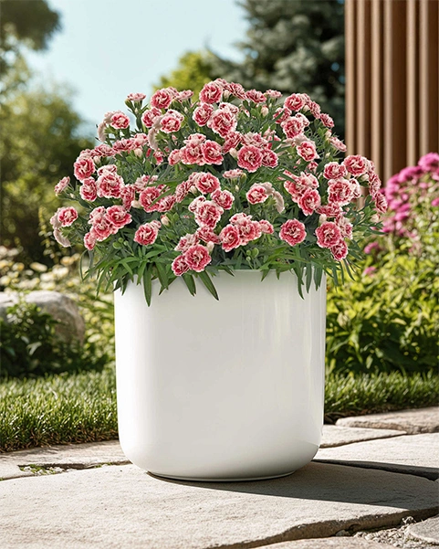 Компактный сорт гвоздики с нежными махровыми цветками нежно-розового оттенка. Куст хорошо разветвлённый, формирует обильные цветки с выраженной махровостью. Отличается продолжительным и пышным цветением, сохраняя декоративность в течение всего сезона.