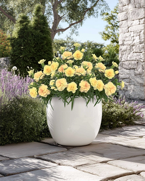Яркий сорт гвоздики с насыщенными желтыми махровыми цветками. Формирует компактный, хорошо разветвленный куст с обильным и продолжительным цветением. Цветки крупные, с выраженной махровостью, сохраняют декоративность в течение длительного периода.