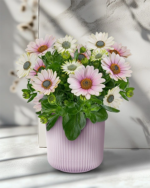 Карликовый сорт остеоспермума с нежными бело-сиреневыми соцветиями. Крупные цветки диаметром 5–6 см украшены градиентной окраской: нежно-сиреневые лепестки плавно светлеют к центру, создавая эффект свечения. Плотные кусты с жесткими побегами сохраняют форму даже при сильном ветре и дожде.