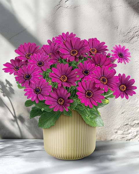Карликовый сорт остеоспермума с яркими двухцветными соцветиями. Крупные цветки диаметром 5–6 см отличаются оригинальной окраской: нежно-сиреневые лепестки с контрастными белыми полосами и тёмно-фиолетовым центром. Плотные, хорошо разветвлённые кусты формируют обильноцветущие шаровидные куртины.