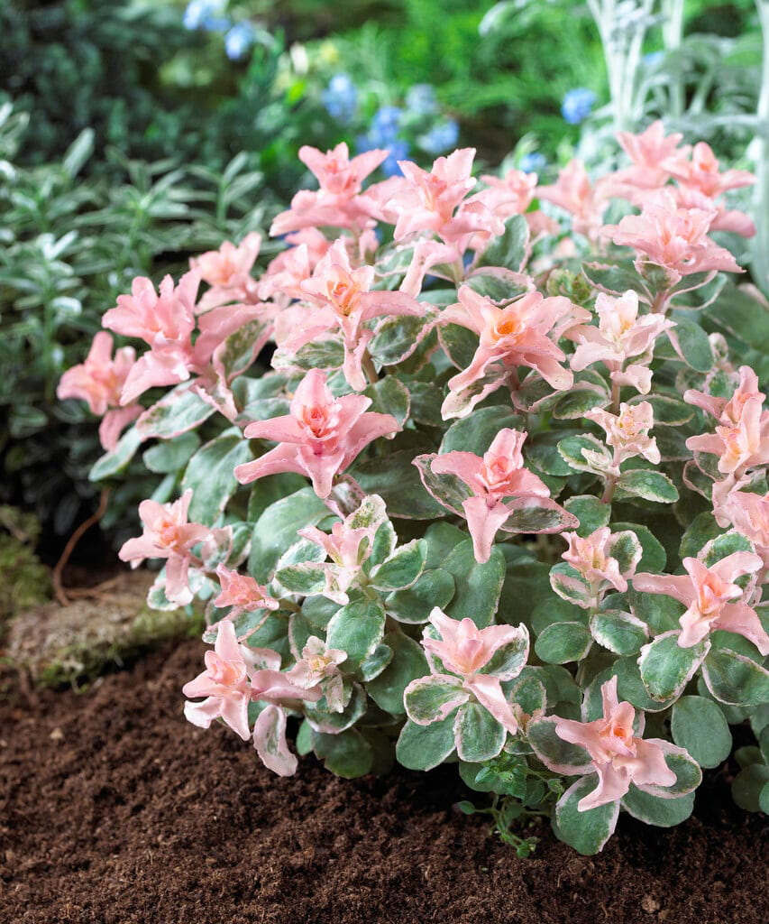 В отличие от почвопокровных седумов, формирует не «коврик», а выразительный, собранный куст с мясистой декоративной листвой. Листья очень эффектные, по краям слегка гофрированные, серо-зеленые с голубым отливом, розовой каймой и кремовыми мазками. В конце лета растение покрывается плотными шапками розовых соцветий. Хорошо переносит жару и засуху, сохраняет форму весь сезон. Подходит для бордюров, рокариев и контейнеров. Устойчив к болезням и вредителям. Зимостойкость до −35 °С.