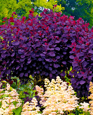 Листва этого растения меняет оттенки по мере роста: от винно-красного до темно-красно-синего, а осенью становится ярко-оранжево-красной. Цветки – большие темно-розовые метелки, которые появляются в начале лета, а к осени созревают плоды-костянки темно-коричневого цвета. Скумпия – долгожитель и может радовать вас до ста лет. Высота – до 6 м.