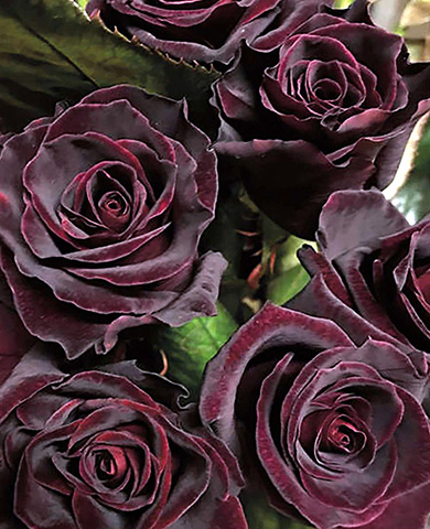 Один из немногих сортов роз такого темного окраса. Цветки чашеобразной формы, достигающие 9–10 см в диаметре, плотные и густомахровые, с лепестками вишнево-бордового оттенка, отливающими черным бархатом. Интенсивность цвета варьируется в зависимости от погодных условий и кислотности почвы. Аромат очень тонкий, почти незаметный.