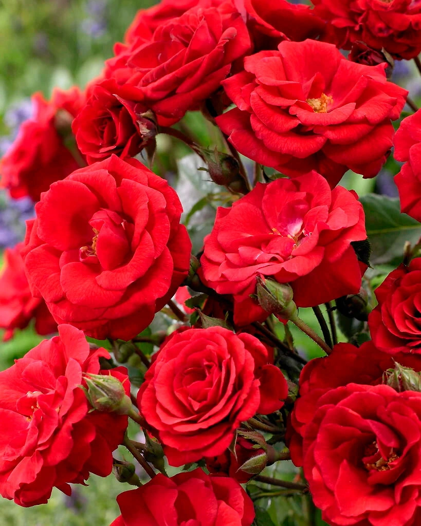 Прямостоячий плотный куст со средними махровыми цветками карминно-красного цвета. Цветки распускаются медленно, хорошо сохраняют форму и долго держатся на кусте. Отлично контрастируют с яркой, блестящей темно-зеленой листвой. Цветение обильное, волнообразное, с июня до заморозков. Один из лучших сортов для живой изгороди.
