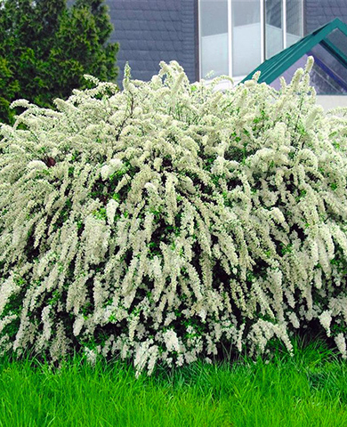 Великолепный быстрорастущий куст с компактной густой кроной и свисающими вниз, ветвящимися побегами. Белоснежные зонтичные соцветия с ароматом меда плотно покрывают ветки. Цветение обильное и продолжительное. Листья серебристо-серые или пепельно-зеленые. Сорт легко переносит стрижку. Устойчив к засухе и хорошо приспосабливается к городским условиям. Укрытия на зиму не требует.
