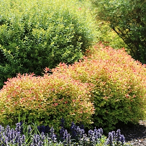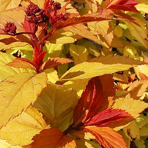 Мимо не пройдешь от восхищенья! Ее прямостоящие побеги скрыты под шапкой листвы самой разнообразной расцветки: на одном кусте могут быть салатовые, бронзовые, ярко-желтые, красно-коричневые и медно-оранжевые листья. Лист продолговатый, по краю зубчатый, 5–8 см длиной. Окраска зависит от количества солнечного света и меняется в течение сезона. Цветет обильно ярко-розовыми соцветиями, собранными в щиткообразные кисти. Цветут кусты почти все лето.