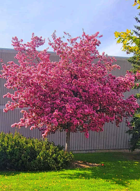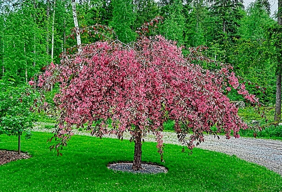 Раскидистая зонтичная крона в мае покрывается темно-бордовыми бутонами и малиново-красными цветками. Плоды декоративные, небольшого размера, долго остаются на ветках. Благодаря выразительному силуэту и изящным фиолетовым ветвям дерево сохраняет эффектный внешний вид осенью и зимой.
