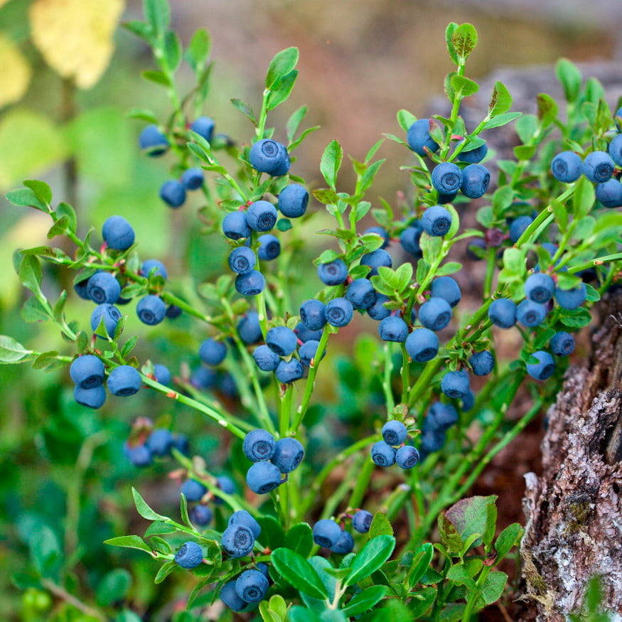 Колоссально полезная и невероятно вкусная северная ягода. Плоды округлые или слегка сплющенные, ароматные. Цвет варьируется от голубого до почти черного, кожица средней толщины покрыта сизым налетом. Мякоть пурпурная, плотная, сладкая. Созревают с начала июля по сентябрь, но уже спелые ягоды могут долго висеть на кусте, становясь только слаще. Их едят свежими, добавляют в мороженое, йогурт, готовят из них напитки, начинку для выпечки, сушат, морозят, и, конечно же, варят джемы и варенье. Употребление в пищу черники укрепляет сосуды, на дает образовываться тромбам. Железо, входящее в состав черники, усваивается организмом намного лучше, чем из лекарственных препаратов. Листопадные кусты высотой 15-30 см неприхотливы, влаголюбивы, декоративны в конце лета и осенью. Цветут в мае желтовато-розовыми цветками. Обладают высокой устойчивостью к вредителям и болезням. Высаживать лучше в полутени, под пологом деревьев. Зимует без укрытия.