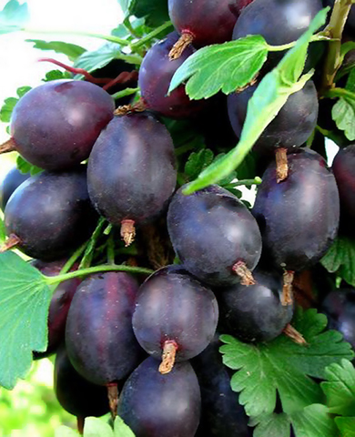 Невысокий куст с крепкими, толстыми побегами, сверху до-низу усыпанными крупными, ягодами. Ведь не зря этот сорт крыжовника получил такое название – Черносливовый. Ягоды покрыты восковым налетом, достигают веса 10 г, имеют овальную форму, и в полной зрелости становятся почти черными. Кожица тонкая, а мякоть сочная и нежная. Вкус тоже необычный, сочетает в себе кисло-сладкие нотки со специфическим ароматом сливы.