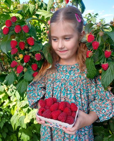 Великолепные ягоды с высокой концентрацией сахара. Остаются крупными до глубокой осени. Почти каждая из них весит около 9–10 г, и это не предел. Плоды плотные, насыщенно-красного цвета, сердцевидной формы, невероятно сладкие, с выраженным малиновым ароматом. Легкий пруиновый налет на ягодах защищает урожай от подпекания. Урожай начинает поспевать в конце июля и продолжает до начала октября на побегах текущего года. Куст с мягкими шипами, вырастает до 1,5 м. Хорошо сопротивляется большинству болезней. Зимостойкость высокая.