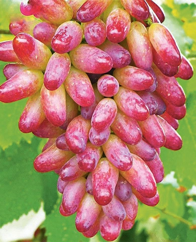 Этот виноград неизменно поражает своими характеристиками: мощный раскидистый куст формирует грозди весом 1-3 кг конической формы. Ягоды удлиненной формы с золотисто-розовой окраской отличаются изысканным вкусом - при полном созревании становятся очень сладкими с нежной кожицей.