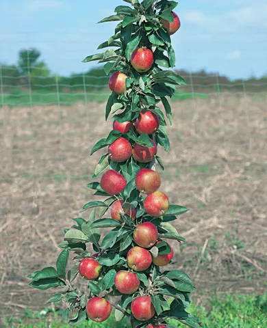 Сорт характеризуется очень высокой урожайностью – до 10 кг. Осенью компактное деревце выглядит особенно декоративно, когда ярко-малиновые яблоки буквально облепляют ствол и короткие плодовые веточки. Урожай созревает в конце сентября и отлично сохраняется до весны.