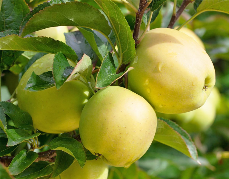 Плоды притягательного янтарно-желтого оттенка, иногда с нежным румянцем, весят около 150 граммов и прочно держатся на ветках до самого сбора. Урожай может радовать вас всю зиму и даже весну, так как отлично хранится до полугода. Дерево вырастает до 3 метров и уверенно переносит морозы до -29°C. Для завязывания плодов требуется соседство других яблонь.