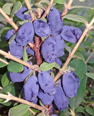 Этот сорт созревает к началу июля. Ягоды удлиненные, с сизым налетом на темно-фиолетовой кожице, мякоть плотная, кисло-сладкая, с медово-пряным ароматом и легкой горчинкой. Чем они более зрелые, тем ярче раскрывается вкус. Отлично подходят как для употребления в свежем виде, так и для кулинарной обработки. Куст достигает в высоту 1,8 м, побеги довольно тонкие, с красивой глянцевой корой. Плодоношение начинается со второго года жизни растения.