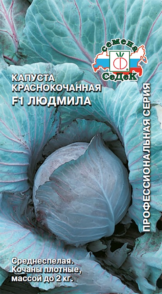 Семена Капуста к/к Людмила F1. Среднеспелый (125-130 дней) гибрид. Розетка листьев приподнятая, лист мелкий, фиолетово-зеленый, с сильным восковым налетом. Кочаны полуприкрытые, округлые, на разрезе темно-фиолетовые, массой 1,5-2,0 кг, плотные, сочные. Наружная кочерыга короткая, внутренняя - средней длины. Урожайность: 5,1 кг/м2. Ценность гибрида: стабильно высокая урожайность, выравненность кочанов, длительная сохранность товарных качеств на корню, при транспортировке и хранении. Рекомендуется для употребления в свежем виде и переработки.