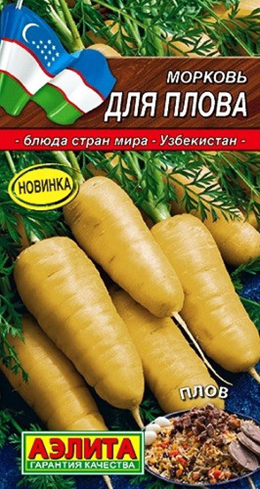 Семена Морковь Для плова. Специально подобранный сорт сладкой, скороспелой моркови для приготовления вкуснейшего, традиционного плова. Пучковая спелость наступает через 45-50 дней после появления всходов, уборочная – через 80-90 дней. Корнеплоды желтые, цилиндрические, гладкие, с тупым концом, длиной 10-13 см., средней массой 80-100 г. Устойчивые к растрескиванию. Мякоть сочная и нежная, практически без сердцевины. Сорт подходит для домашней кулинарии и замораживания. Предпочтительны плодородные почвы легкого мех. состава. До появления всходов посевы укрывают нетканым материалом для сохранения влажности почвы. Первую прорывку проводят в фазе двух настоящих листьев, вторую – при достижении корнеплодами 1 см. Возможен подзимний посев в конце октября – начале ноября.