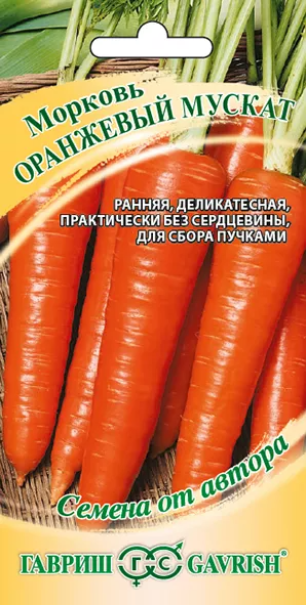 Семена Морковь Оранжевый мускат. Ранний надежный сорт, ежегодно обеспечивает хорошим урожаем. Корнеплод цилиндрический со слабым сбегом к кончику, оранжевый, практически без сердцевины, длиной 15-16 см., массой 100-160 гр. Мякоть сочная, сладкая, с прекрасными вкусовыми качествами. Отличный сорт для сбора пучками, хорошо подходит для хранения. Урожайность 2,7-6,5 кг/м2. Посев семян в грунт производится в конце апреля – начале мая на глубину 1 см., расстояние между рядками 18-20 см. Подросшие всходы прореживают, оставляя между растениями по 5-6 см.