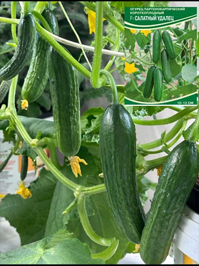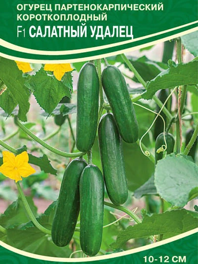 Огурец Салатный Удалец F1 - гибрид раннеспелый, партенокарпический, салатный, для теплиц и открытого грунта. От всходов до начала плодоношения 40-42 дня. Растение генеративного типа, листья средние, зелёные. В одном узле формируется 1-2 зеленца. Плоды цилиндрические гладкие, тёмно-зелёной однородной окраски, блестящие, длиной 10-12 см, без полос, массой 160-180 граммов, кончик зелёный, не желтеет, шейка отсутствует. Плоды генетически без горечи, консистенция плотная. Вкусовые качества отличные. Товарность высокая, транспортабельные. Гибрид устойчив к настоящей мучнистой росе (Pх) и кладоспориозу (Ccu), толерантен к перепадам температуры. Стрессоустойчивый. Используется для потребления в свежем виде. Рекомендуется для выращивания во всех типах теплиц в весенне-летнем и летне-осеннем обороте, а также открытом грунте. Плотность посадки 2,2-2,5 раст./м2. Урожайность16-17 кг/м2.