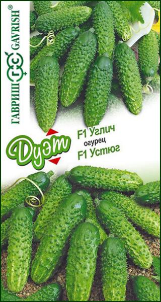 Огурец F1 УГЛИЧ: Скороспелый (47-50 дней от всходов до плодоношения) партенокарпический (не требует опыления) гибрид. Предназначен для выращивания в открытом грунте, под временными пленочными укрытиями и в теплицах. В пазухе листа образуется по 2-3 завязи. Зеленец длиной 10-13 см., массой 100-110 гр., бугорчатый, бурошипый, без горечи. Использование плодов универсальное. Гибрид имеет относительную устойчивость к основным заболеваниям огурца.